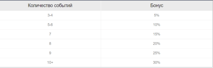Чем больше исходов включено в экспресс, тем более щедрый бонус получает игрок. Представляем вашему вниманию схему его начисления: